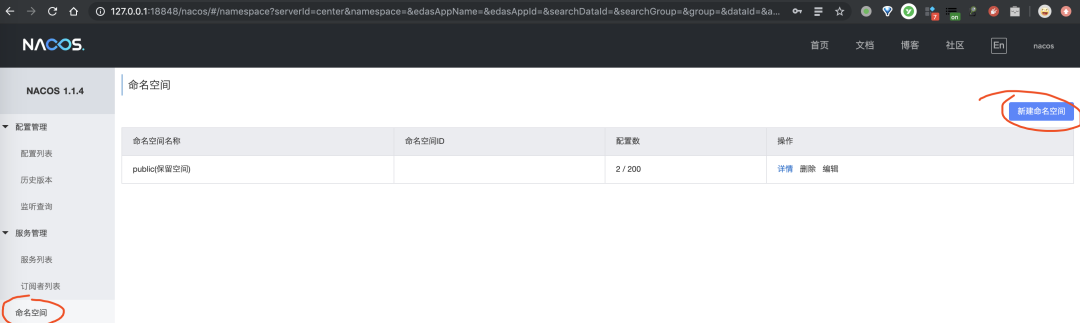 ① 打开 Nacos UI 界面的「命名空间」菜单,进入「命名空间」功能。如下图所示: