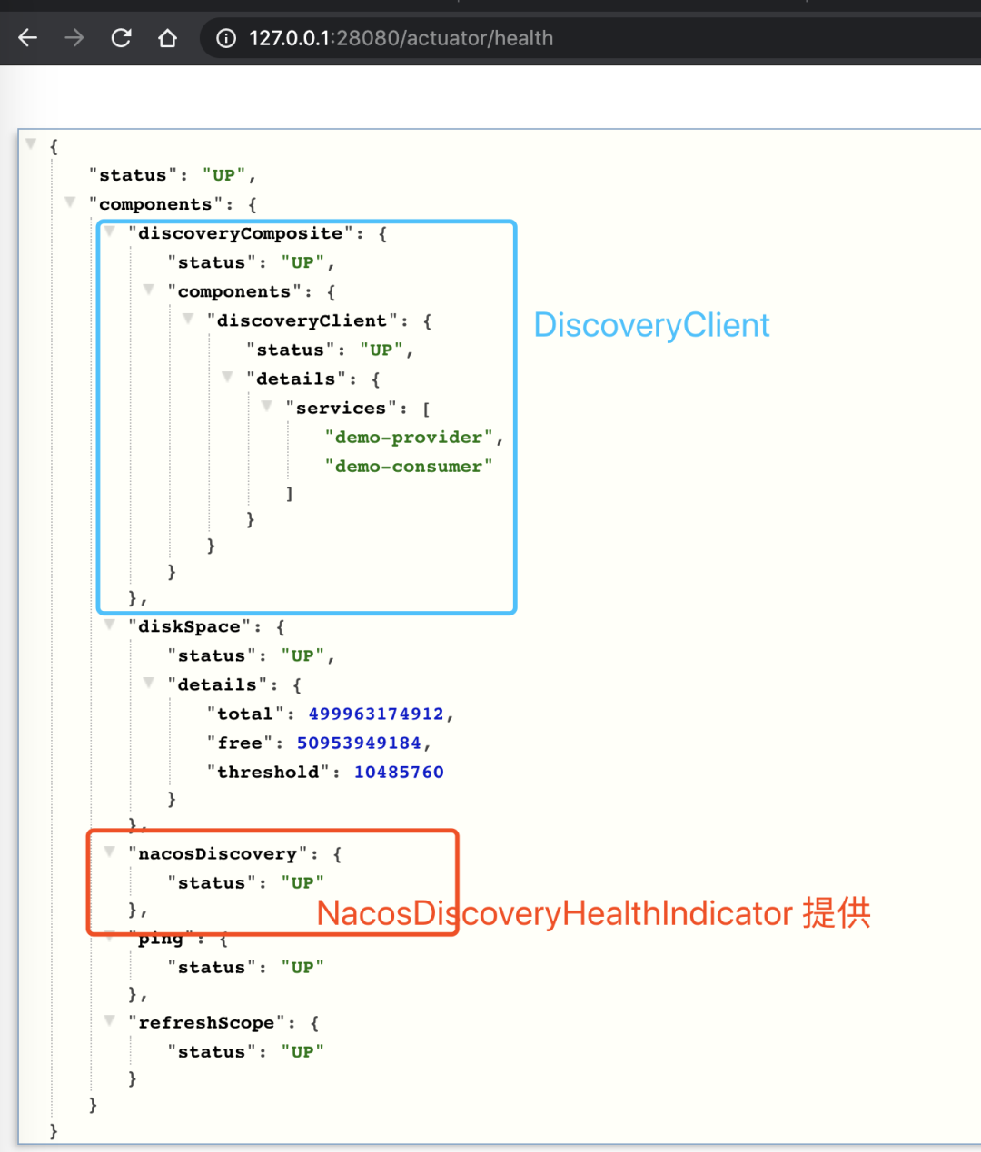 同时,Nacos Discovery 拓展了 Spring Boot Actuator 内置的 health 端点,通过自定义的 NacosDiscoveryHealthIndicator,获取和 Nacos 服务器的连接状态。