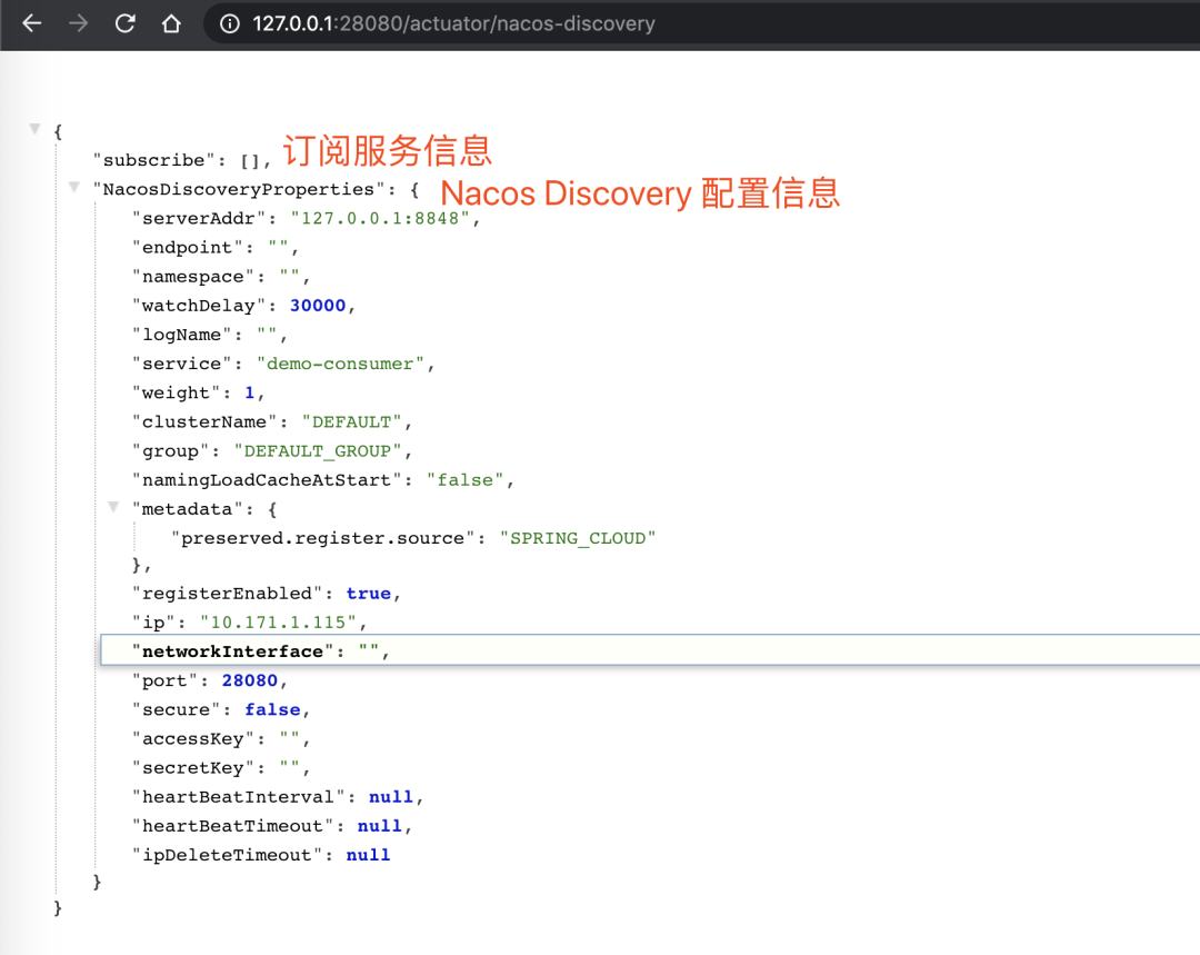 ② 访问服务消费者的 nacos-discovery 监控端点 http://127.0.0.1:28080/actuator/nacos-discovery,返回结果如下图: