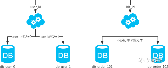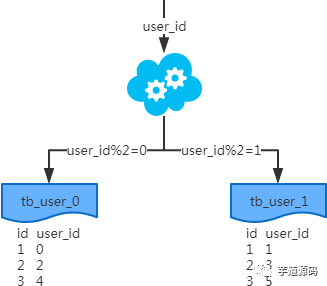注:写入时,基因法生成user_id,如图。关于xbit基因,例如要分8张表,23=8,故x取3,即3bit基因。根据user_id查询时可直接取模路由到对应的分库或分表。根据user_name查询时,先通过user_name_code生成函数生成user_name_code再对其取模路由到对应的分库或分表。id生成常用snowflake算法。