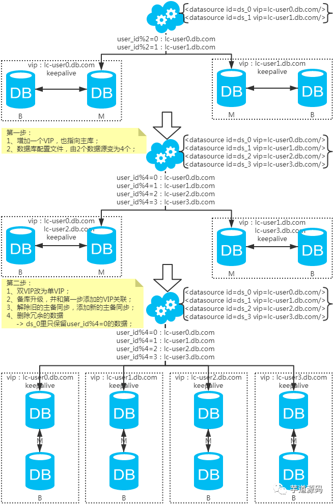 第一步:(同步双写)修改应用配置和代码,加上双写,部署;第二步:(同步双写)将老库中的老数据复制到新库中;第三步:(同步双写)以老库为准校对新库中的老数据;第四步:(同步双写)修改应用配置和代码,去掉双写,部署;
