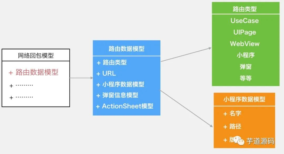 首先,微信支付业务特点就是和网络密切相关,流程和页面往往是由 Cgi 串联起来。因此建立模型时,最外层便是网络回包。对于路由机制,这里我们只关心路由数据模型。