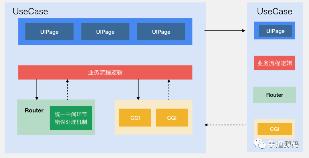 因此,为了适应微信支付流程多,界面跳转复杂的特点。架构抽象的第一步就是将业务流程抽象为一个独立的角色 UseCase。同时, 把界面抽象为 UIPage。一个大的业务流程可以分解为一个个小的业务流程。