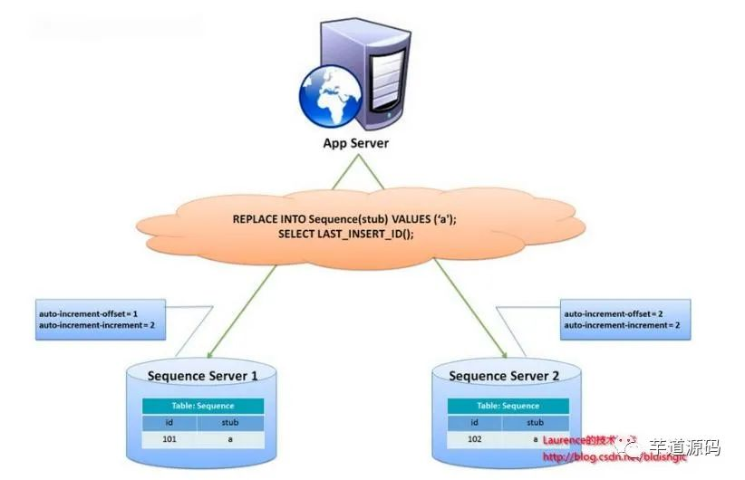 此方案较为简单,但缺点较为明显:存在单点问题,强依赖DB,当DB异常时,整个系统不可用。配置主从可以增加可用性。另外性能瓶颈限制在单台Mysql的读写性能。另有一种主键生成策略,类似sequence表方案,更好的解决了单点和性能瓶颈问题。这一方案的整体思想是:建立2个以上的全局ID生成的服务器,每个服务器上只部署一个数据库,每个库有一张sequence表用于记录当前全局ID。表中增长的步长是库的数量,起始值依次错开,这样就能将ID的生成散列到各个数据库上