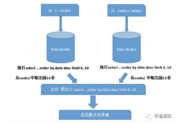 上图只是取第一页的数据,对性能影响还不是很大。但是如果取得页数很大,情况就变得复杂的多,因为各分片节点中的数据可能是随机的,为了排序的准确性,需要将所有节点的前N页数据都排序好做合并,最后再进行整体排序,这样的操作很耗费CPU和内存资源,所以页数越大,系统性能就会越差。在使用Max、Min、Sum、Count之类的函数进行计算的时候,也需要先在每个分片上执行相应的函数,然后将各个分片的结果集进行汇总再次计算。
