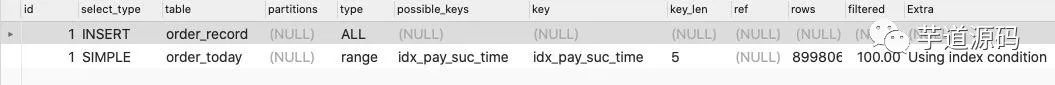 由于查询条件会导致order_today全表扫描,什么能避免全表扫描呢,很简单嘛,给pay_success_time字段添加一个idx_pay_suc_time索引就可以了,由于走索引查询,就不会出现扫描全表的情况而锁表了,只会锁定符合条件的记录。