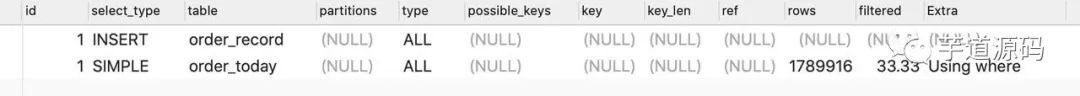 通过观察迁移sql的执行情况你会发现order_today是全表扫描,也就意味着在执行insert into select from 语句时,mysql会从上到下扫描order_today内的记录并且加锁,这样一来不就和直接锁表是一样了。