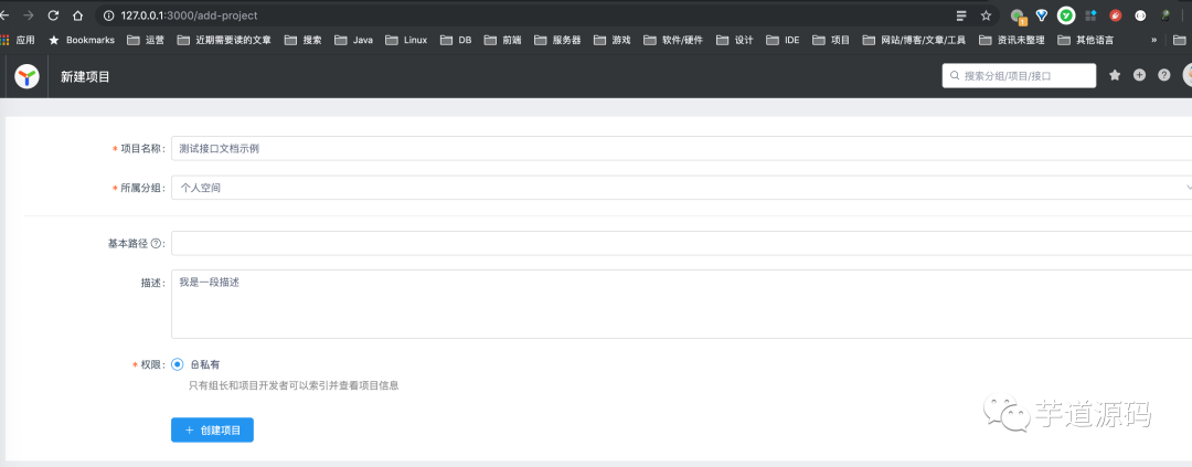 登陆成功后,自动跳转到主界面,点击右边的「添加项目」按钮,进入「新建项目」的界面(http://127.0.0.1:3000/add-project) 。如下图:
