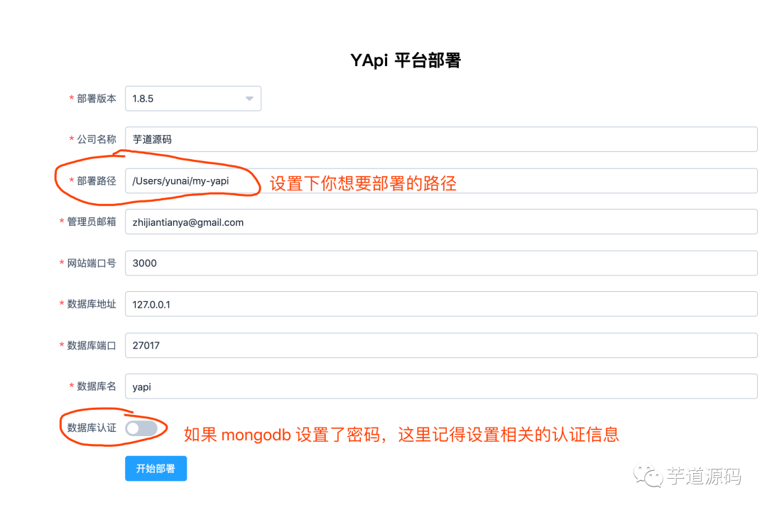 在浏览器打开 http://127.0.0.1:9090 地址,设置 YApi 平台部署的信息。如下图: