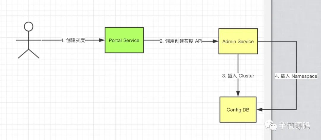 本文分享 Portal 创建灰度 的流程,整个过程涉及 Portal、Admin Service ,如下图所示: