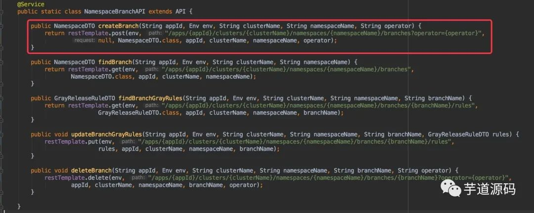 com.ctrip.framework.apollo.portal.api.NamespaceBranchAPI ,实现 API 抽象类,封装对 Admin Service 的 Namespace 分支模块的 API 调用。代码如下: