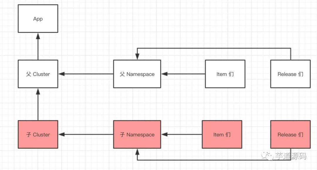 创建灰度,调用的是创建 Namespace 分支 的 API 。通过创建的子 Namespace ,可以关联其自己定义的 Cluster、Item、Release 等等。关系如下所图所示: