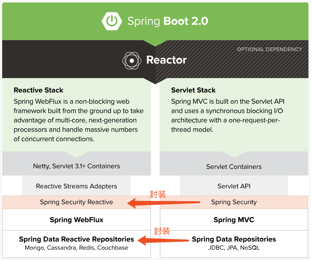 ???? 仔细看第一层的两个框框,分别是上面提到的 WebFlux 的两种编程模型。表达的是 SpringMVC 不支持 Router Functions 方式,而 WebFlux 支持。