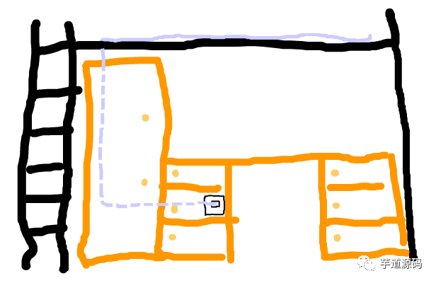 为了不暴露没电脑还插着根网线那么荒唐,于是尽量沿着有遮挡的柜子布线,从衣柜后一直拖到床铺。剩下的水平部分就埋在床边的缝隙里,并用席子盖着。
