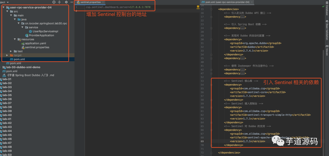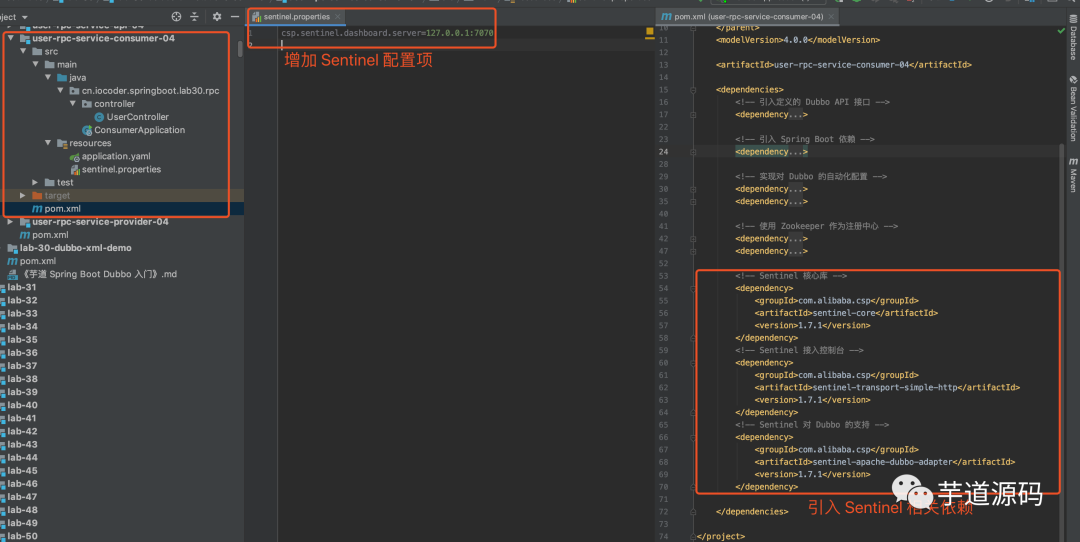 将「2. 快速入门」小节的 user-rpc-service-consumer-02,复制出 user-rpc-service-consumer-04,接入 Sentinel 实现服务消费者的流量控制。改动点如下图: