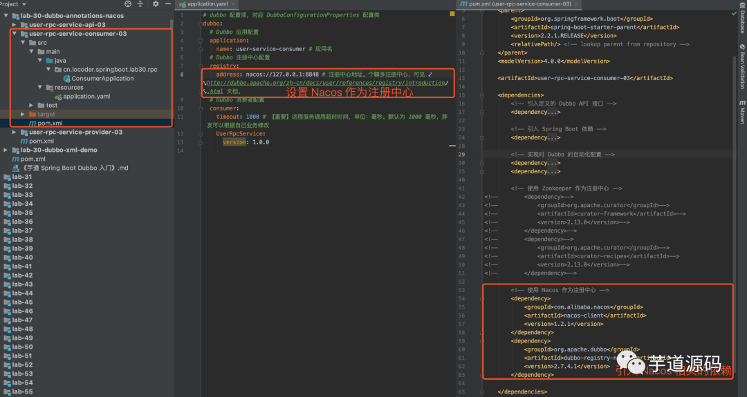将「3. 注解配置」小节的 user-rpc-service-consumer-02,复制出 user-rpc-service-consumer-03,接入 Nacos 作为注册中心。改动点如下图: