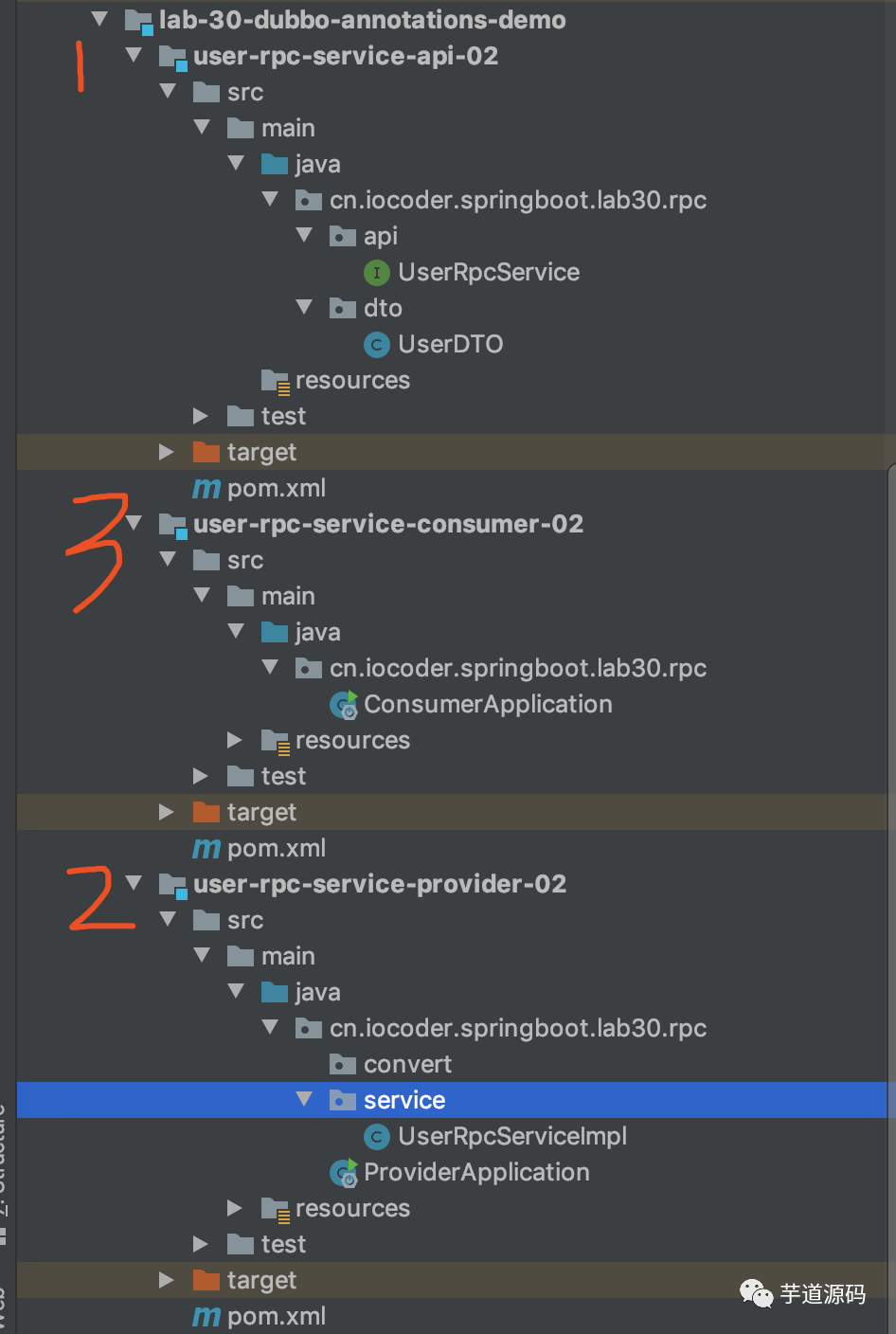 user-rpc-service-api项目:服务接口,定义 Dubbo Service API 接口,提供给消费者使用。详细代码,我们在 「2.1 API」 讲解。user-rpc-service-provider项目:服务提供者,实现user-rpc-service-api项目定义的 Dubbo Service API 接口,提供相应的服务。详细代码,我们在 「2.2 Provider」 中讲解。user-rpc-service-consumer项目:服务消费者,会调用user-rpc-service-provider项目提供的 Dubbo Service 服务。详细代码,我们在 「2.3 Consumer」 中讲解。