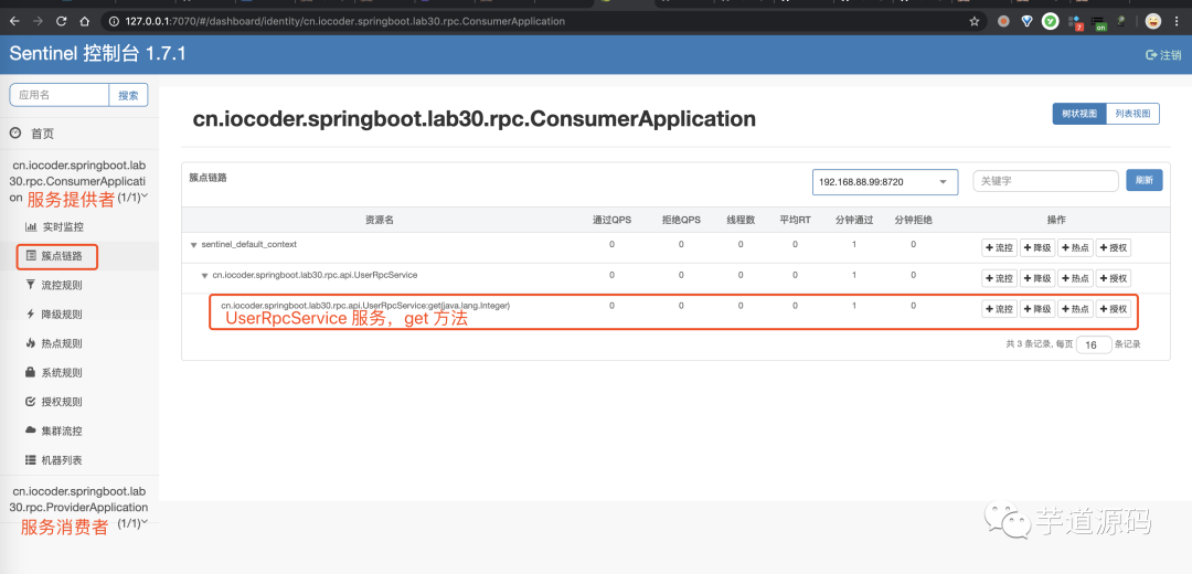 而 Sentinel 对服务提供者的流量控制是一样的,胖友可以自己去尝试。