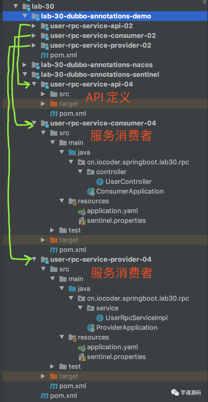还是老样子,我们从「3. 注解配置」小节,复制出对应的三个 Maven 项目来进行改造,进行 Sentinel 的整合。最终项目如下图所示: