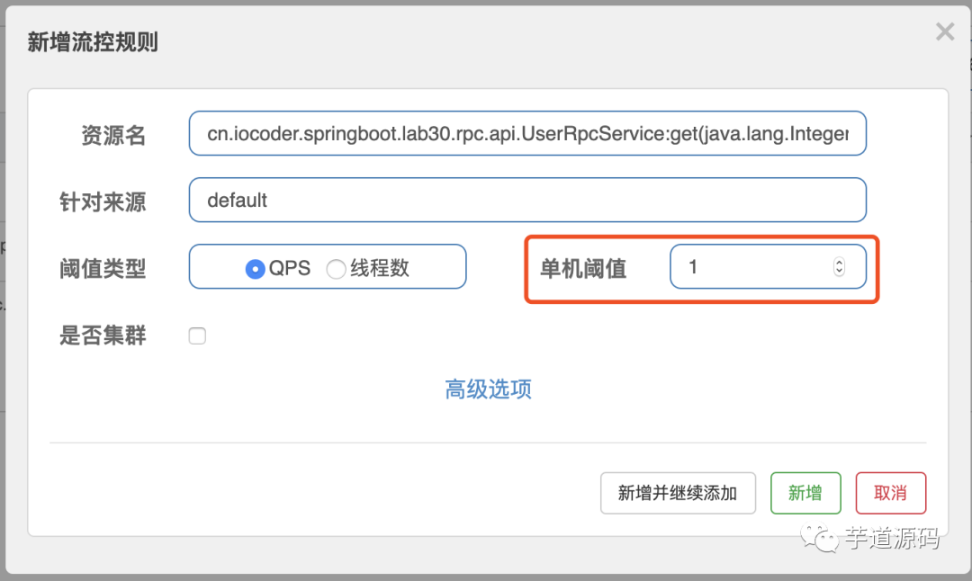 点击 n.iocoder.springboot.lab30.rpc.api.UserRpcService.UserRpcService:get(java.lang.Integer) 资源所在列的「流控」按钮,弹出「新增流控规则」。填写流控规则,如下图所示: