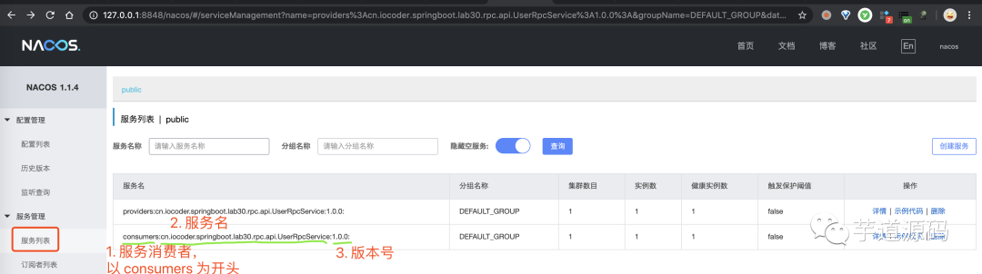 ② 使用 ConsumerApplication 启动服务消费者。在 Nacos 控台中,我们可以看到以 consumers 为开头的服务消费者,如下图所示: