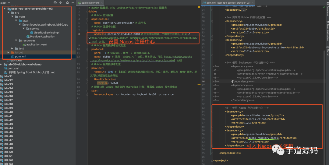 将「3. 注解配置」小节的 user-rpc-service-provider-02,复制出 user-rpc-service-provider-03,接入 Nacos 作为注册中心。改动点如下图: