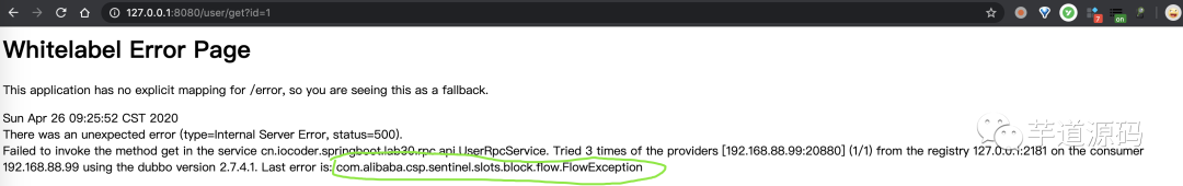 ④ 使用浏览器,快速访问 http://127.0.0.1:8080/user/get?id=1 接口两次,会调用 UserService#get(Integer id) 方法两次,会有一次被 Sentinel 流量控制而拒绝,返回结果如下图所示: