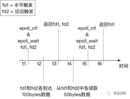 考虑下图中的例子。有两个socket的fd——fd1和fd2。我们设定监听f1的“水平触发读事件“,监听fd2的”边沿触发读事件“。我们使用在时刻t1,使用epoll_wait监听他们的事件。在时刻t2时,两个fd都到了100bytes数据,于是在时刻t3, epoll_wait返回了两个fd进行处理。在t4,我们故意不读取所有的数据出来,只各自读50bytes。然后在t5重新注册两个事件并监听。在t6时,只有fd1会返回,因为fd1里的数据没有读完,仍然处于“被触发”状态;而fd2不会被返回,因为没有新数据到达。