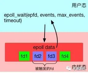 同时,epoll_wait直接只返回了被触发的fd列表,这样上层应用写起来也轻松愉快,再也不用从大量注册的fd中筛选出有事件的fd了。