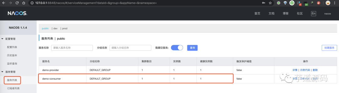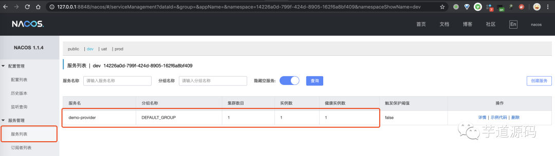 ② 打开 Nacos 控制台,可以在服务列表看到服务 demo-provider 注册在命名空间 dev 下。如下图: