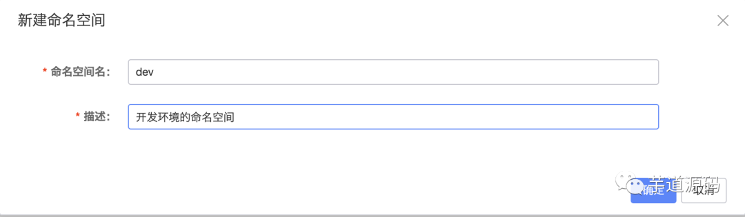 ② 点击列表右上角的「新建命名空间」按钮,弹出「新建命名空间」窗口,创建一个 dev 命名空间。输入如下内容,并点击「确定」按钮,完成创建。如下图所示:
