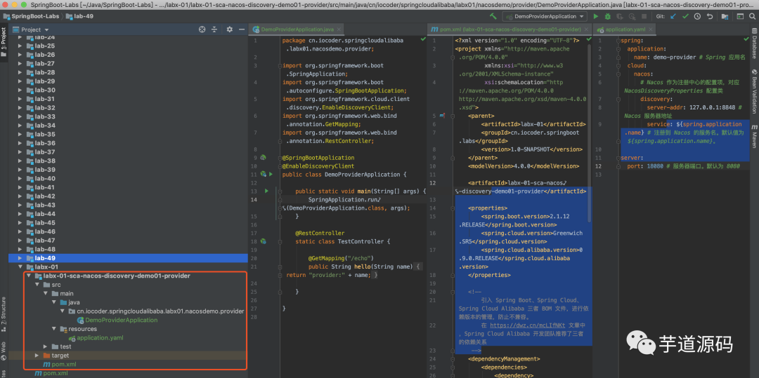创建 labx-01-sca-nacos-discovery-demo01-provider 项目,作为服务提供者 demo-provider。最终项目代码如下图所示: