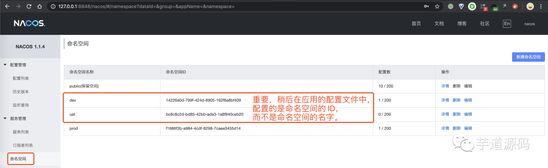 首先,我们会在 Nacos 中创建开发环境使用的 Namespace 为