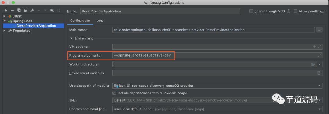 ① 先配置 --spring.profiles.active 为 dev,设置 DemoProviderApplication 读取 application-dev.yaml 配置文件。如下图所示: