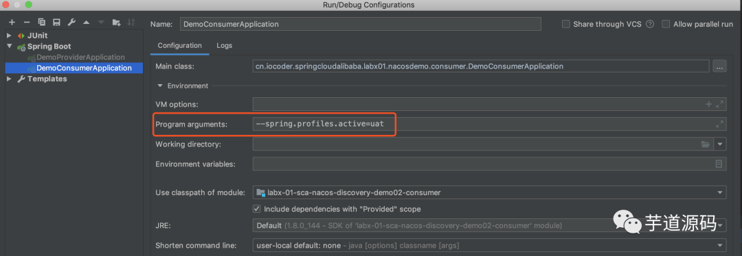② 再配置 --spring.profiles.active 为 uat,设置 DemoConsumerApplication 读取 application-uat.yaml 配置文件。如下图所示: