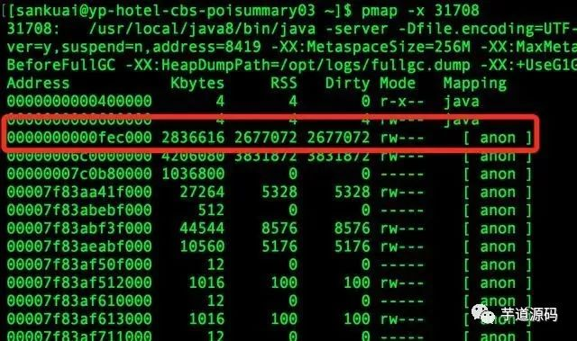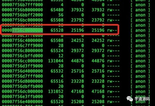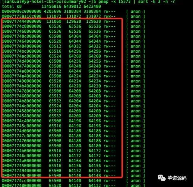 为了防止误判,笔者使用了pmap查看内存分布,发现大量的64M的地址;而这些地址空间不在jcmd命令所给出的地址空间里面,基本上就断定就是这些64M的内存所导致。