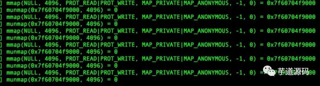 因为使用gperftools没有追踪到这些内存,于是直接使用命令“strace -f -e”brk,mmap,munmap” -p pid”追踪向OS申请内存请求,但是并没有发现有可疑内存申请。strace监控如下图所示: