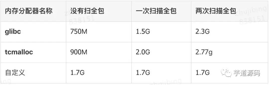 笔者做了一下测试,使用不同分配器进行不同程度的扫包,占用的内存如下: