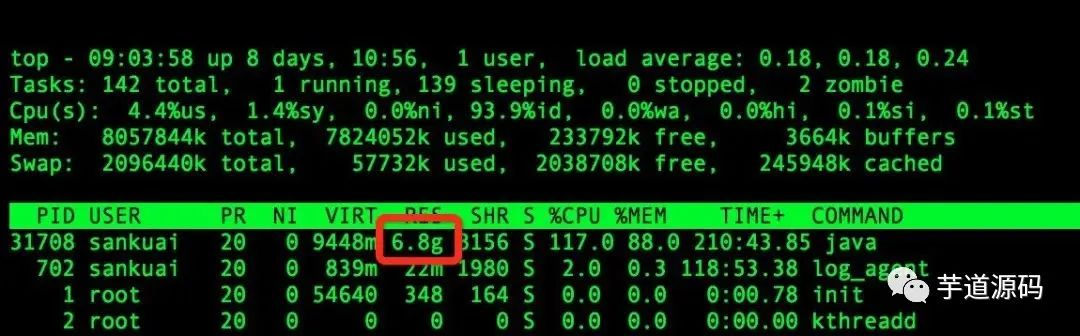 为了更好地实现对项目的管理,我们将组内一个项目迁移到MDP框架(基于Spring Boot),随后我们就发现系统会频繁报出Swap区域使用量过高的异常。笔者被叫去帮忙查看原因,发现配置了4G堆内内存,但是实际使用的物理内存竟然高达7G,确实不正常。JVM参数配置是“-XX:MetaspaceSize=256M -XX:MaxMetaspaceSize=256M -XX:+AlwaysPreTouch -XX:ReservedCodeCacheSize=128m -XX:InitialCodeCacheSize=128m, -Xss512k -Xmx4g -Xms4g,-XX:+UseG1GC -XX:G1HeapRegionSize=4M”,实际使用的物理内存如下图所示: