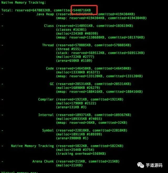 发现命令显示的committed的内存小于物理内存,因为jcmd命令显示的内存包含堆内内存、Code区域、通过unsafe.allocateMemory和DirectByteBuffer申请的内存,但是不包含其他Native Code(C代码)申请的堆外内存。所以猜测是使用Native Code申请内存所导致的问题。
