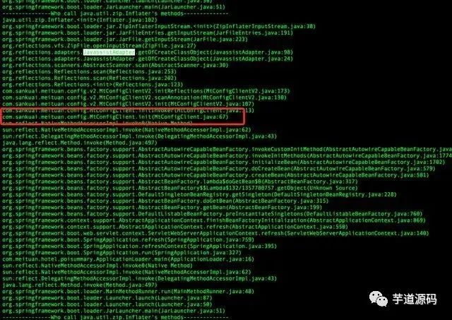 这里基本上就可以看出问题来了:MCC(美团统一配置中心)使用了Reflections进行扫包,底层使用了Spring Boot去加载JAR。因为解压JAR使用Inflater类,需要用到堆外内存,然后使用Btrace去追踪这个类,栈如下: