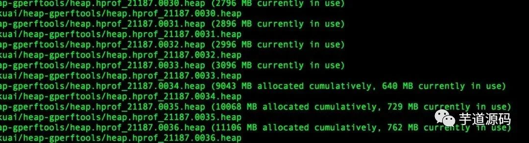 这时,再返过来看gperftools的内存分布情况,发现使用Spring Boot时,内存使用一直在增加,突然某个点内存使用下降了好多(使用量直接由3G降为700M左右)。这个点应该就是GC引起的,内存应该释放了,但是在操作系统层面并没有看到内存变化,那是不是没有释放到操作系统,被内存分配器持有了呢?