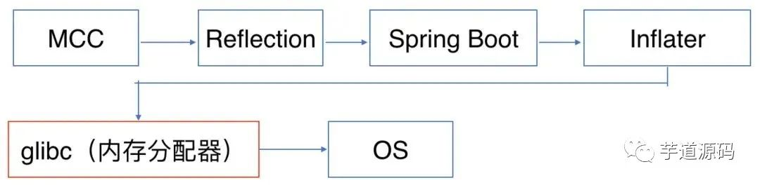 整个内存分配的流程如上图所示。MCC扫包的默认配置是扫描所有的JAR包。在扫描包的时候,Spring Boot不会主动去释放堆外内存,导致在扫描阶段,堆外内存占用量一直持续飙升。当发生GC的时候,Spring Boot依赖于finalize机制去释放了堆外内存;但是glibc为了性能考虑,并没有真正把内存归返到操作系统,而是留下来放入内存池了,导致应用层以为发生了“内存泄漏”。所以修改MCC的配置路径为特定的JAR包,问题解决。笔者在发表这篇文章时,发现Spring Boot的最新版本(2.0.5.RELEASE)已经做了修改,在ZipInflaterInputStream主动释放了堆外内存不再依赖GC;所以Spring Boot升级到最新版本,这个问题也可以得到解决。
