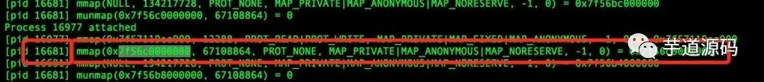 项目启动使用strace追踪系统调用,发现确实申请了很多64M的内存空间,截图如下: