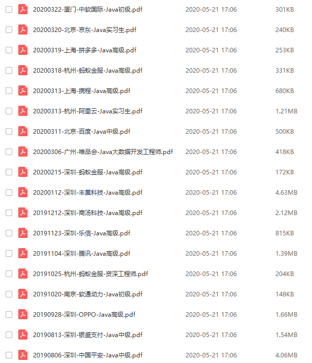 面试题有:蚂蚁金服、拼多多、阿里云、百度、唯品会、携程、丰巢科技、乐信、软通动力、OPPO、银盛支付、中国平安等初,中级,高级Java面试题集合。