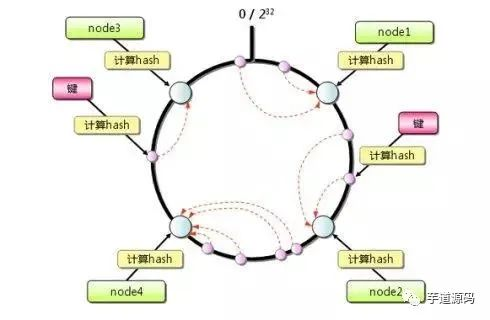 该算法对2^32 取模,将Hash值空间组成虚拟的圆环,整个圆环按顺时针方向组织,每个节点依次为0、1、2…2^32-1,之后将每个服务器进行Hash运算,确定服务器在这个Hash环上的地址,确定了服务器地址后,对数据使用同样的Hash算法,将数据定位到特定的Redis服务器上。如果定位到的地方没有Redis服务器实例,则继续顺时针寻找,找到的第一台服务器即该数据最终的服务器位置。