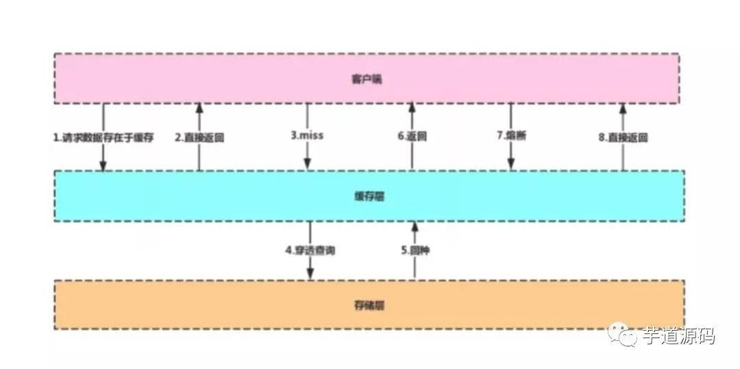 客户端在对数据库发起请求时,先到缓存层查看是否有所需的数据,如果缓存层存有客户端所需的数据,则直接从缓存层返回,否则进行穿透查询,对数据库进行查询,如果在数据库中查询到该数据,则将该数据回写到缓存层,以便下次客户端再次查询能够直接从缓存层获取数据。
