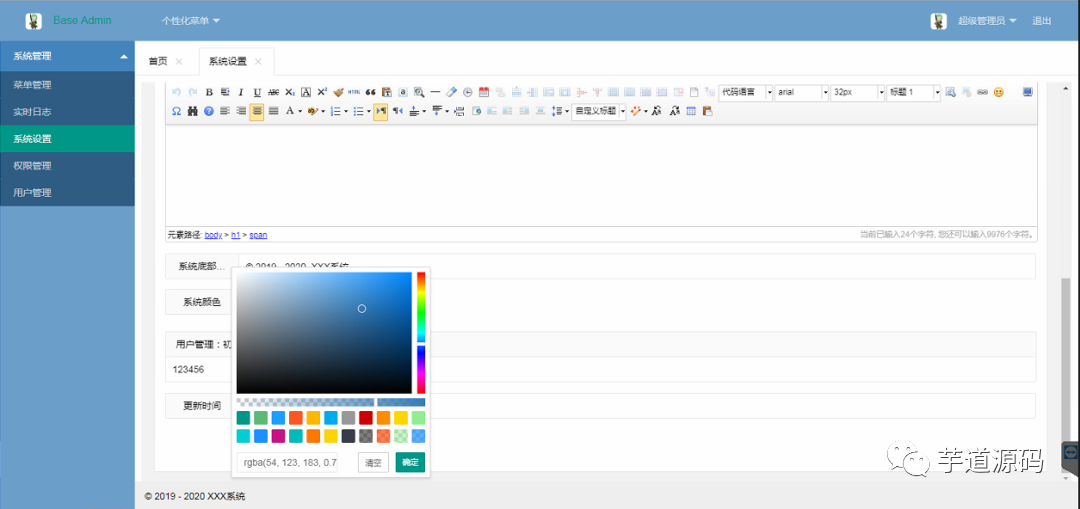 3、系统设置新增系统颜色,头部、左侧菜单的颜色可按心情切换(SQL文件已同步更新)