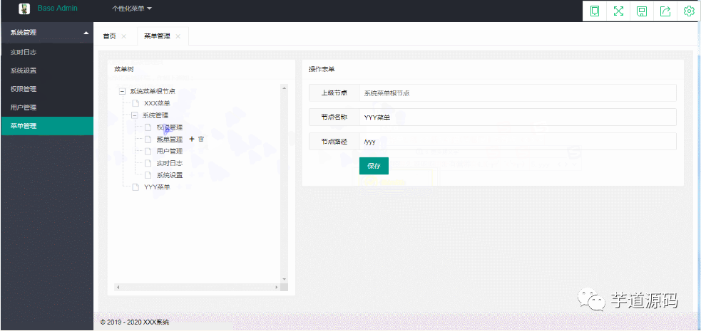 这套Base Admin是一套简单通用的后台管理系统,主要功能有:权限管理、菜单管理、用户管理,系统设置、实时日志,实时监控,API加密,以及登录用户修改密码、配置个性菜单等