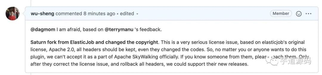 “Saturn 是 fork 自 ElasticJob,并更改了版权信息,这是一个非常严重的许可证问题。基于 ElasticJob 的原始许可证 Apache 2.0 ,所有文件的 header 都应该保留,即便他们修改了代码。所以,无论你或是任何人想要做这个插件,我们都不能正式接受它作为 Apache SkyWalking 的一部分。如果你认识他们,请联系他们。只有在他们纠正了许可证问题,并且回滚了所有的 header 之后,我们才能支持他们的新版本。
